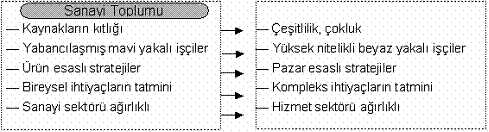 2 - Sanayi Toplumu Sanayi devrimi ile birlikte, bu anlayışta bir değişiklik oldu. Artık iktisadi faaliyet, bir araç olmaktan çıktı ve amaç haline geldi. İnsanlar Allah'a kulluk etmek amacıyla yaşamak yerine daha müreffeh yaşamayı daha rahat olmayı ve isteklerini daha çok yapabilir hale gelmeyi tercih etmeye başladılar. Kar etmek temel motive edici faktör olarak, ön plana çıktı. Böyle olunca bu değişimin gereklerini yerine getirmek üzere yeni araçlar geliştirme ihtiyacı doğdu. Bilim ve teknoloji bu noktada devreye girerek, temel çalışma kurallarını, davranış tarzlarını ve bunlarla ilgili ilkeleri ortaya koydu. Artık geçmiş dönemdeki geleneklerin ve dini inançların yerine, sanayi toplumunda bilim ve teknoloji alıyordu. Böylece insanlar daha çok üretmenin, daha çok para kazanmanın yollarını tespit etmeye başladılar. Öncelikle dağınık ve küçük ölçekli olan üretim arttı. Büyük işçi kitleleri oluştu ve büyük işletmeler kurulmaya başlandı. İşte bu dönemde bir yönüyle işletmecilikte devrime başlanmış oldu. Devrim bir anlamda pazar ekonomisine geçiş ve üretimin merkezileşmesi demektir. Sanayi toplumunu hazırlayan sanayi devrimi bazı kaynaklarda otomasyon ve mekanizasyon olarak safhalandırılsa bile, (3) bazı kaynaklarda da emekle çalışan makina, buharla çalışan makina ve elektrikle çalışan makina olmak üzere üç safhaya ayırmışlardır. (4) Kısaca sanayi toplumunu tanımlamamız gerekirse, genel olarak, kendi kendilerine yeten insanların ve toplulukların yerine, tarihte ilk kez yiyeceklerin malların ve hizmetlerin çok büyük bir bölümünün satışa ya da değiş tokuşa sunulduğu bir durum ortaya çıkmıştır. Hemen hemen, kimsenin, hatta bir çiftçinin bile, kendi kendisi için yeterli olmadığı bir uygarlık ortaya çıkmıştır. Genel olarak, sanayi toplumu, şu özellikler taşımaktadır: Teşebbüs aileden ayrılmıştır. İşbölümü profesyonel hale gelmiştir. Sermaye birikiminin varlığı söz konusudur. İşte üretimde rasyonallik temel öğe olmuştur. Yani daha önceki geleneksel ve dinsel davranışlar yerini rasyonal davranışlara bırakmıştır. (5) Sanayi toplumunda, üretimde mekanizasyon ve otomasyon, örgütler, merkezileşme, fabrika, pazara yönelik üretim, standartlaşma, uzmanlaşma, eşgüdüm, çekirdek aile tipi, ve işçi sınıfı karakteristik özellik taşır.