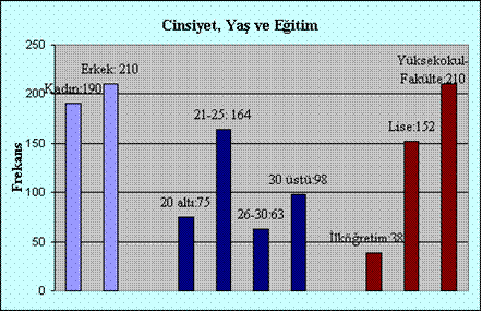 Örnek kitleği oluşturan, 400 kişinin sosyo-demografik özelliklerinin dağılımı Tablo 1 ve Grafik 1’de gösterilmiştir. Cevaplayıcıların %47,5 Bayan, %52,5 Erkektir. Cevaplayıcıların %18,75’i 20 yaş altı, %41’i 21-25, %15,75’i 26-30 ve %24,5’i 30 yaş üstündedir. Eğitim durumuna baktığımızda %9,5’u İlköğretim, %38’i Lise ve %52,5’i Yüksekokul/Fakülte mezunu olduğu görülmektedir.