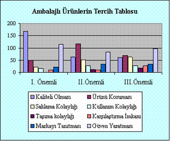 Tablo 4 ve Grafik 4’te tüketicilerin ambalajlı ürünü tercih ederken dikkat ettikleri özellikler önem düzeyine göre gösterilmiştir. Cevaplayıcılar ambalajlı ürün seçerken birinci olarak ürünün kaliteli olduğunu düşündükleri için (%42) tercih ettiklerini ikinci olarak ambalajın ürünü koruduğu için (%29) ve üçüncü olarak da ambalajlı ürünün kendilerinde güven yarattığını için (%24,4) tercih ettikleri şeklinde sıralamışlardır. Ambalajın üründe kalite imajı verdiği, kullanım kolaylığı sağladığı ve güven duygusu yarattığını bulgular göstermektedir.
