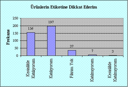 Tablo 6 ve Grafik 6’da tüketicilerin ürünlerin etiketlerine dikkat düzeylerine baktığımızda ankete katılan cevaplayıcıların %88,25’inin ürünlerin etiketlerine dikkat etme yargısına katıldıkları (4,24 ile) görülmektedir. Bu oran cevaplayıcıların, etiket üzerindeki bilgilerin ürünün satın alınmasında etkin olduğunu göstermektedir. Tüketicilerin çoğunun etiket bilgisine başvurduğunu ve bu konuda duyarlı davrandığını söyleyebiliriz.