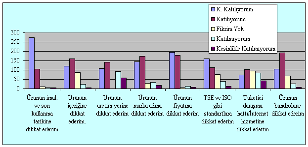 Bu sonuçlardan tüketicilerin ürünlerini hangi süre içinde kullanacakları, enflasyon nedeniyle sık ve sürekli değişen fiyatının ne olduğu, sağlık açısından ürünün bileşiminin hangi maddelerden meydana geldiğini ortaya koyan bilgiye ihtiyaç duyup öğrenmek istediklerini söyleyebiliriz. Tüketicilerin danışma hattı/internet hizmeti üretim yeri gibi bilgilere dikkat düzeylerinin daha düşük olduğunu görüyoruz. Bilinçli tüketicilerin sayısı arttıkça ve teknolojik gelişmelere tüketiciler uyum sağladıkça bu bilgilere dikkat düzeyi artabilir.