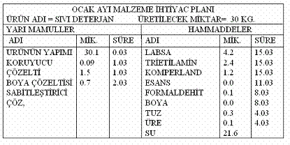 Ayrıntılı üretim planları Çizelge 5’de gösterildiği gibi olup, Çizelge 6’de gösterilen malzeme ihtiyaç planları aynı alt modül tarafından hazırlanmaktadır. Malzeme ihtiyaç planlaması normal ve fazla mesaide üretilecek miktarlara göre hesaplanmakta olup, yan sanayide üretilecek miktarlara ait ürünler için gerekli malzeme, hazırlanan listelere dahil edilmemektedir.