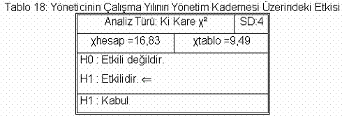 Yapılan χ² analizine göre, işletmede çalışma yılının yönetim kademesi üzerinde etkili olduğu ortaya çıkmıştır. Veriler incelendiğinde, üst kademe yöneticilerin 3 yıl ve daha uzun süre çalışanlardan oluştuğu görülmektedir. Orta kademe yöneticiler ise, 1 yıldan az çalışanlarla, 1-3 yıl arası çalışanlardan oluşmaktadır. Turizm işletmelerinde genelde personel devir hızı yüksek olmakta iken,[43] bu sonuç bize seyahat acentalarında yönetici devir hızının düşük olduğunu göstermektedir.