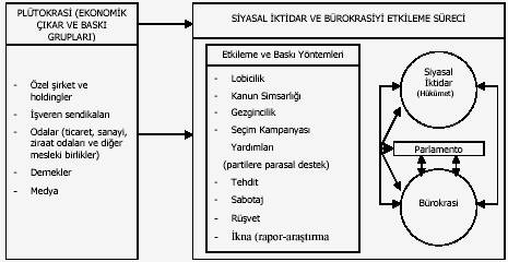 Kaynak: Coşkun Can AKTAN, “Teşvik Kollamacılık”, Yolsuzlukla Mücadele Stratejileri, Ankara:Hak-İş Yayınları, 2001. Çıkar ve baskı grupları amaçlarına ulaşmak için devlet üzerinde çok sayıda baskı yolları kullanabilmektedirler. Şekilde açıklandığı üzere çıkar ve baskı grupları (Özel şirket ve holdingler, işveren sendikaları, odalar, dernekler medya) bir takım etkileme ve baskı yöntemleri ile siyasi iktidarı, parlamentoyu ve bürokrasiyi etkilemektedir. Bu tür baskı yollarını genel olarak yedi başlık altında toplayabiliriz (Tan,03.11.2002). İkna: Çıkar ve baskı gruplarının devlet üzerinde baskı kurma yollarından birisi ikna etme yöntemidir. Çıkar ve baskı grupları siyasi iktidar ve bürokrasiyi etkilemek için çeşitli araştırma raporları ve projeler hazırlayıp yetkililere sunarlar.Bu tip faaliyetlere özellikle büyük sendikalar, ticaret odaları ve meslek odaları gibi geniş çaplı gruplar gerçekleştirirler. Lobicilik: Baskı gruplarının amaçlarına ulaşmak için parlamentoda yaptıkları çalışmalardır. Lobiciliğin olmadığı siyasal sistem yoktur (http://www.mfa.gov.tr/Turkce/grup/ha/ha03bhtm/03.htm). Ekonomik çıkar ve baskı grupları; hükümet üyeleri, yasama organı üyeleri ve bürokratlarla gizli görüşmeler yaparak kendi çıkarları doğrultusunda düzenlemeler yapılmasını sağlayabilirler. Meclis koridorları, bir yemek, ziyafet veya partiler lobicilik için uygun zeminlerdir. Lobicilik yapanlar; milletvekilleri, bürokratlar, profesyonel yöneticiler ve benzeri kimseler olabilir. Çıkar ve baskı grupları için lobicilik yapan milletvekilleri veya bürokratlar, parlamentodaki diğer milletvekili ve ya bürokratları da etkilemeye çalışırlar. Bu nedenle, çıkar ve baskı grupları bu aracıların etkin ve nüfuzlu kişiler olmasına dikkat ederler. Seçim Kampanyası Yardımları: Çıkar ve baskı grupları,seçim öncesinde politikacıların kampanya harcamalarına yardım ederek bir sonuç elde etmeye çalışırlar. Politikacılara kampanya desteği sağlamanın, çıkar ve baskı gruplarının kullandığı yollardan en masraflı olanı olmakla birlikte en etkili olanı olduğu da söylenebilir. Çünkü seçilmiş olan milletvekilleri kendilerine destek verenlere karşı borçlarını ödemek için çıkar ve baskı gruplarının isteklerine boyun eğmek zorunda kalmaktadırlar. Çıkar ve baskı grupları yapacakları kampanya destekleme harcamalarını tek bir adayda toplamak yerine adayların kazanamama risklerini de (Çaha,1997:425) göz önüne alarak bir anda birden fazla adayı desteklemektedirler. Rüşvet: Çıkar ve baskı gruplarının devlet üzerindeki baskı kurma yöntemlerinden bir diğeri de rüşvettir. Politikacı veya genel olarak kamu görevlilerine rüşvet vererek çıkar ve baskı grupları belli bir rant elde edebilirler. Rüşvet kanuna uygun kamu işlerinin çabuklaştırılması ve kanuna uygun olmayan işlerin menfaat karşılığı yerine getirilmesi için görev ve yetkilerin kötüye kullanılması gibi iki şekilde ortaya çıkar (Aktan,1992:25). Tehdit: Çıkar ve baskı gruplarının devlet üzerindeki en geniş etki etme yollarından birini oy verme süreci oluşturmaktadır. Baskı ve çıkar grupları seçimler esnasında kendilerine rahatlıkla rant sağlayabilecekleri siyasal grupları başa getirmek için başta medya olmak üzere bir çok araç kullanarak seçmenleri kendi tercihleri doğrultusunda yönlendirebilirler. Destekledikleri siyasi partinin kendi çıkarları doğrultusunda hareket etmemesi durumunda ise bir dahaki seçimlerde desteklememe, bir başka siyasi partiyi destekleme veya medya yoluyla siyasi iktidarı yıpratmaya çalışma tehdidinde bulunma söz konusu olabilir. Toplu Eylem: Siyasal sistemi olağan yollardan etkileyemeyen çıkar ve baskı grupları gösteri ve mitinglere başvurabilirler. Bu yolun tercihi, siyasi sistemin duyarsız davranması karşısında ortaya çıkabileceği gibi, baskı grubunun zayıf bir örgütsel yapıya sahip olması ve olağan yolları kullanamaması sonucunda da belirebilir (Tan,03,11.2002). Amaç, kamuoyunun ilgisini çekmek, siyasi otoriteye problemlerin sandıklarından önemli oldukların göstermektir. Boykot ve grevler ise siyasi bir baskı yolu olarak zaman zaman kullanılmaktadır. Siyasi partilerin hiçbirinin işçi sorunları ile ilgilenmediğini öne sürerek, üyelerinin seçimi boykot etmesini isteyen sendikalarla, üretimi durdurma eylemi uygulayan işçilerin eylemlerinin siyasi süreci etkilemek için yapıldığı söylenebilir. Medya: Çıkar ve baskı grupları, kitle iletişim araçlarını kullanarak siyasi iktidarı destekleme kampanyası yürütebilirler, kendi ilgilendikleri konuda yetkilileri etkilemek için propaganda faaliyetlerine girişebilirler. Bazı baskı grupları, gazete ve dergi gibi yayın organlarını reklam vermek, yazarları çeşitli biçimlerde ödüllendirmek yolu ile etki altına alabilirler. 2. TÜRKİYE’DE BİRLİKLER 2.1. Türkiye’de Ekonomi Politikası Birliklerinin Çeşitleri Ekonomi politikası birliklerini, siyasi otoriteye kendi çıkarları doğrultusunda hareket etmesi için baskı uygulayan baskı grupları olarak tanımlamıştık. Türkiye’deki baskı grupları genel olarak üç ana grupta ele alınmaktadır (Erkan,1992:100): · Geniş anlamda ekonomi politikası birlikleri, yani sendikalar: Türkiye İşverenler Sendikası (TİSK), TÜRKİŞ, DİSK ve HAKİŞ gibi konfederasyonlar bu gruba girmektedirler. · Dar anlamda ekonomi politikası birlikleri, yani ekonomik çıkarlarını savunmak için kurulan her türlü oda ve dernek türü kuruluşlar: Ticaret, Sanayi, Ziraat Odaları ve Borsalar ile konfederasyon olarak TOBB bu gruba girmektedir. · Meslek birlikleri: Hem sektörel hem genel olarak örgütlenmiş olan kuruluşları ve dernekleri kapsamaktadır. TÜSİAD, YASED, Anadolu İşadamları Derneği, Otomo