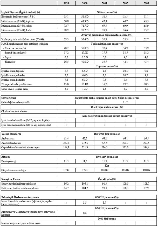 Kaynak: Uzun vadeli işsizlik oranı: Eurostat; İşsizlik oranı – toplam, erkekler, kadınlar: 1998- 1999 ulusal İşgücü Anketi, 2000-2003 Eurostat, bütün diğer göstergeler: Ulusal İşgücü Anketi.