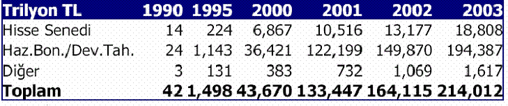 İMKB’de işlem gören şirketlerin piyasa değeri halka arzlarla birlikte artarken, yaşanan krizler, piyasa değerlerinde düşüşler yaşatmıştır. 2003 yılında ise yükselme trendine girilmiştir. Sermaye piyasasının kurulduğu günden bu güne bakıldığında menkul kıymet stokunda Devlet İç Borçlanma Senetleri ağırlıklı olarak yer alırken, Hazine’nin ihtiyacı ile birlkte artışa neden olmuştur. 2003 yılında yurtiçi tasarrufların içinde sabit getiril menkul kıymetlerin miktarı 2002 yılına göre yüzde 61.8 oranında artışla 56.4 milyar dolara yükselirken mevduatlar ise bir önceki yıla göre 2003 yılında yüzde 94.6 oranında artışla 105.6 milyar dolara yükselmiştir. Tahmini altın stoku yüzde 81.6 artışla 78.4 milyar olurken halka açık şirketlerin piyasa değeri yüzde 48.5 artışla 16.9 milyar dolar olmuştur.