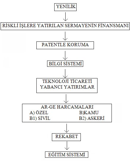 Şekil 1’de yenilik ve yayılmanın temelini yetenekli bireylerin, mühendislerin ve yöneticilerin sayısında artışa neden olan eğitim sisteminin oluşturduğu görülmektedir. Yetenekleri arttırmada önemli bir unsur olan okul ve üniversite eğitiminin yanı sıra yeniden eğitim ve iş eğitimi de önemlidir[25]. Ulusal eğitim ve öğretim sistemi araştırma enstitüleri, teknolojik bilgi kaynakları, danışmanlık hizmetleri ve devlet laboratuarlarının çeşitliliği kadar firmaların yenilik performansını etkiler[26].