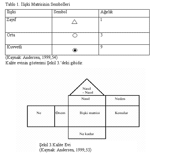 “Neden”, müşterilerin rakip işletmelerle yaptıkları değerlendirmleri göstermektedir. Ürün özellikleri, süreç özellikleri, süreç performans özellikleri rakiplerle karşılaştırılabilir. Müşteri gereksinimlerinin nasıl karşılanabileceğine karar verdikten sonra- böylece “Nasıl”- ilişki matrisinde “Ne” ve “Nasıl” bağlantısı tamamlanmış olmaktadır. Kalite evinin çatısı da bir ilişki matrisi oluşturmaktadır. Çatıda “Nasıl”ların farklı elemanları arasında herhangi ilişkinin olup olmadığını araştırılmaktadır. Bu matriste, pozitif ve negatif ilişkilerin olasılığı araştırılmaktadır. Diğer bir deyişle, kalite evinin çatısı mühendislik özellikleri arasındaki çelişkileri görünür kılmaktadır(24): “Bu çelişkiler, ürünün yaşam çevrimi boyunca ortaya çıkabilecek problemler için kritik alanlardır. Çelişkilerin çözümlenmesi için özel bir çaba gösterilmelidir”. Bu matris için bazı yaygın semboller, aşağıdaki Tablo 2’de olduğu gibidir.