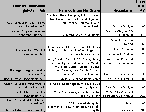 Tablo1’de, 1 Ocak 2007 tarihi itibariyle Türkiye’de faaliyet gösteren tüketici finansman şirketlerinin, satışı için finansman sağladığı ürün grubu, hissedarlar ile hisse oranları yer almaktadır. Krediler konusunda yapılan bir araştırmaya göre “tüketici kredileri, otomotiv sektöründe satışları %88, dayanıklı tüketim ürünlerinde ise % 47 oranında artırdığı ortaya çıkmıştır.“ (Karan, 1994:57). Türkiye’de tüketici finansman şirketlerinin geçmişi incelendiğinde 1999 krizine kadar tüketici finansmanı ve kart hizmetlerinin sayısı oldukça fazla olduğu görülmektedir. Ancak krizle beraber bir çok finansman şirketi de faaliyetine son vermiştir. 2005 yılında 7 tane olan finansman şirketi sayısı 2005 yıl sonunda 2 şirkete daha faaliyet yetki belgesinin verilmesiyle birlikte bu sayı 9’a yükselmiştir.