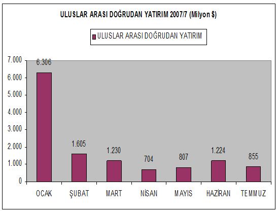 2007 yılı Temmuz ayında 855 milyon ABD Doları düzeyinde uluslararası doğrudan yatırım girişi (fiili giriş/net) gerçekleşmiştir. Yılın ilk yedi ayı içinde en fazla doğrudan yatırım girişi 6.306 milyon dolar ile Ocak ayında gerçekleşmiştir.