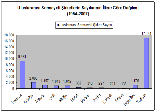 İstanbul ilinde faaliyette bulunan 9.361 adet uluslararası sermayeli firmanın başta toptan ve perakende ticaret (3.527 adet) olmak üzere, imalat sanayi (1.933 adet), gayrimenkul kiralama ve iş faaliyetleri (1.212 adet) sektörlerinde faaliyette bulundukları görülmektedir (www.hazine.gov.tr). En fazla yabancı sermayeli yatırım çeken il İstanbul iken toplamda 17.134 yabancı sermayeli şirket bulunmaktadır.