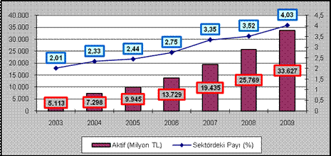 Grafik 1’de 2003-2009 yılları arasında Katılım bankalarının aktif toplamı ve Türk finans sektörü içerisindeki payları gösterilmiştir. 2003 yılında 5.113 milyon TL olan aktif toplamı 2009 yılında 33.627 milyon TL’ye ulaşmıştır. Katılım bankalarının aktif toplamının Türk bankacılık sektörü içerisindeki payının 2003 yılında % 2,01’den, 2008 yılında % 3,52’ye ve 2009 yılında % 4,03’e ulaştığı görülmektedir.