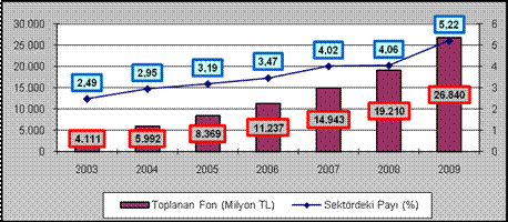 Katılım Bankalarının toplanan fon büyüklüğü rakamsal verilere dayanarak Grafik 2’de gösterilmiştir. Katılım bankalarınca toplanan fonlar 2003 yılında 4.111 milyon TL iken 2009 yılında 26.840 milyon TL’ye ulaşmıştır. Katılım bankalarınca toplanan fonların Türk bankacılık sektörü içerisindeki payının 2003 yılında % 2,49’dan, 2008 yılında % 4,06’ya ve 2009 yılında % 5,22’ye ulaştığı görülmektedir.