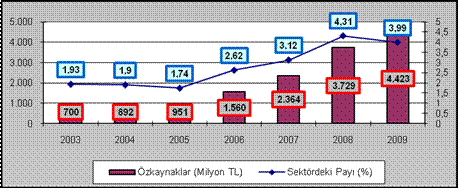 Grafik 6’da Katılım bankalarının özkaynaklarının gelişimi 2003-2009 yılları için gösterilmiştir. Katılım bankalarının özkaynakları 2003 yılında 700 milyon TL iken 2009 yılında 4.423 milyon TL’ye ulaşmıştır. Katılım bankalarının özkaynaklarının Türk bankacılık sektörü içerisindeki payının 2003 yılında % 1,93’den, 2008 yılında % 4,31’e ve 2009 yılında azalarak %3,99’a düştüğü görülmektedir. Sektördeki pay artışlarının 2003-2009 yılları arasında % 206 oranında artış göstermesi Katılım bankalarının özkaynaklarının sağlamlaştığının göstergesidir.