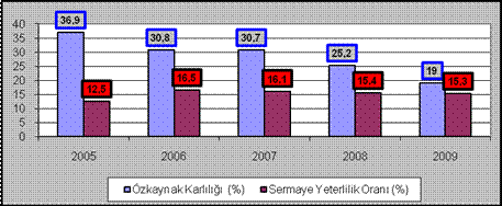 Katılım bankalarının özkaynak kârlılığı ve sermaye yeterlilik oranını gösteren grafik 7’ye göre özkaynak kârlılığı 2005 yılında % 36,9 iken bu oran 2009 yılı için % 19 olarak gerçekleşmiştir. 2009 yılı Haziran ayı itibariyle Türk bankacılık sektöründe % 19 düzeyinde olan sermaye yeterlilik oranı katılım bankalarında bu oranın daha altında seyretmektedir ve 2005 yılında % 12,5 düzeyinden 2009 yılı sonu itibariyle % 15,3 seviyesine çıkmıştır.